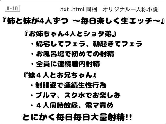 ![姉と妹が4人ずつ ~毎日楽しく生エッチ~ [画像提供元:DLsite.com] 姉と妹が4人ずつ ~毎日楽しく生エッチ~](https://img.dlsite.jp/modpub/images2/work/doujin/RJ200000/RJ199213_img_smp3.jpg)